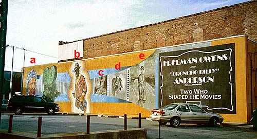 Here's the whole mural. Broncho Billy is labelled with a "b." "a" is Freeman Owens, a Pine Bluff native who developed a method of recording sound directly onto photographic film. "c" is Wallace Beery. He has nothing to do with Arkansas. He was just a pal of Owens. "d" is Peggy Shannon, a girl who grew up in Pine Bluff and made a few movies in Los Angeles. "e" is Charlie Chaplin. He also has nothing to do with Pine Bluff or Arkansas. He's there representing the other artists of Essanay Studios.