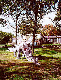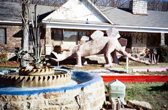 sale on highway 265 between Springdale and Sonora. Just knock on the door of that house in the background. Ask for Leo Case and have your checkbook ready. Until recently, this yard was filled with statues of mules and giant rabbits in addition to dinosaurs. Of late, though, Leo has been dispersing his collection. You're likely to cart one of his sculptures off for a bargain basement price because the highway department has declared this land to be "emminent domain" and has already purchased the property. Mr. Case quoted me a price of $3500 for the steggo; but as the highway project approaches, that price is likely to drop.