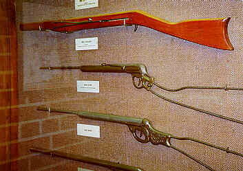 Lest you dismiss the B.B. gun as kid stuff, the musum will remind you that during the Napoleanic Wars, the Austrian army maintained a regiment equipped with 0.44 caliber air rifles. This regiment had a higher rate of fire than a similar number of men equipped with muzzle loaders. They also didn't have to worry about misfires due to wet powder. They also could fire from concealment and remain hidden because their weapons made little noise and left no cloud of smoke. They didn't have to bother transporting quantities of explosive gunpowder or carry cannisters of it into battle, and their personal magazines were never accidentally detonated in battle by a stray spark. These air riflemen were so feared that Napolean ordered all those captured to be summarily executed.