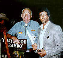 That surly character that looks like he's mugging Jimmy Lile at knifepoint is Sylvester Stallone, a big movie star. That knife was designed and built by Mr. Lile and was used by Mr. Stallone in the movie "First Blood." I guess by the name tags that this photo was taken at some kind of social function associated with the movie. Below are copies of the two knives made by Jimmy at Stallone's request. The bottom knife is the one used in "First Blood." The one above that was used in the sequel and has a blade one inch longer than the first. Bigger movie, bigger knife.