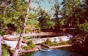 1990's, the land containing Blue Spring was made the centerpiece of a private botannical garden called Eureka Springs Gardens. I suppose a determined person could get himself a drink from Blue Spring and nobody would raise much of a fuss, but the practice is quietly discouraged. The gardens are predictably beautiful, and there's a picturesque trout pond into which you can fling pelletized trout chow purchased from gumball machines found under a green-and-white gazebo.