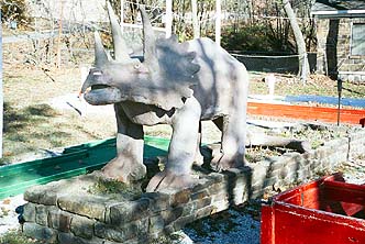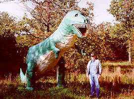 Dinosaurs are a favorite roadside art subject among amateur sculptors. I conjecture they have the proper combination of the exotic-yet-familiar, the scientific-yet-fanciful that allows an unschooled enthusiast enough license to give it a spin without too much fear of criticism. If he tried to make an elephant or a bear, surely some smart aleck would come along ten minutes after the mortar had set up and say, "That ain't right. You got the knees bent the wrong way." But dino subject matter allows the artist to beg off. He's just trying to have a little fun, scientific accuracy notwithstanding.