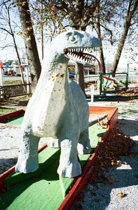 The teeth on this bronto are made from the same stuff as the teeth on the T-rex above. Notice the tongue extends beyond the jaw. No real dinosaur ever stuck out its tongue. They weren't built that way. But as I mentioned above, this is a mini golf course, not the Field Museum, so I'll stop sucking the fun out of the air.