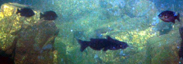 Here's a catfish swimming among the bluegill in the aquarium at the Mid America Museum in Hot Springs. This is a channel cat, the kind catfish farmers raise. The easiest way to tell catfish species apart is by the anal fin. The channel catfish has a rounded, fan shaped fin like this one. The blue catfish has an anal fin that is more square and sharply cut. The flat head catfish has an anal fin that is club shaped. Catfishanoddoes prefer the fluffy snow white meat of blue cat to that of the channel cat; but blue is rarely farmed because it is more difficult to raise. When startled, the fingerlings school into a tight clump, making them easy prey for herons, egrets and the voracious-but-legally-protected cormorants. They also do best in clear water with a strong current, conditions which are hard to replicate in a farm pond. So if you want blue cat, that's a special order and it's going to cost you.