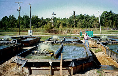 If you're interested in catfish science, here's a catfish scientist. His name is Dr. Nathan Stone, and he teaches aquaculture and conducts research at the University of Arkansas at Pine Bluff Aquaculture Extension. If you want an advanced degree in aquaculture in the U.S. you can go here or maybe a half dozen other places. Dr. Stone is standing amid some experimental intensive culture pools, which might some day come in handy in situations where space is minimal but energy is plentiful. Those thrashing drums aerate the water and induce a current which allows rapid reproduction of phytoplankton which feed the very fecund tilapia which in turn are eaten by catfish. The folks at UAPB are also experimenting with freshwater shrimp in these here pools.