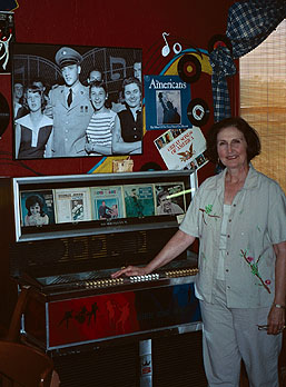 This is Tudy Dorey standing by the jukebox in the 1950's room of her restaurant. There are in fact two pictures of Tudy Dorey here. See that picture on the wall above the jukebox? The guy in the uniform is Elvis Presley returning from Germany on his very first leave from the army. You'll recognize Graceland's front gate in the background. This picture was widely reproduced in newspapers throughout the country. See that girl in the striped top, the one cradled under The King's left arm? That's Tudy enjoying her fifteen minutes of fame.