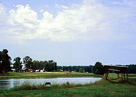 So lets say you invest $15,000 and build one five acre pond. That's not your only expense, of course. Your five acre pond will consume upwards of $20,000 in fish food and medicine a year. So you're in the hole upwards of $35,000 before you make your first crop. That doesn't include the cost of the stocking fry. And if you were thinking of making a living at this, you might multiply your initial debt by a factor of ten or even twenty. Oh yeah, says Mr. Haney, if you think some water might look nice in that pond you're going to have to spring for a new well. Otherwise an August drought might leave you with several tons of sun dried catfish. What about machinery? You can't just dump a bag of feed into a pile at the shoreline and figure the catfish are going to file past cafeteria style. The competition will result in some big fish and some runts. No, you have to buy a machine that launches fish pellets like snow from a blower all across the pond so all your livestock get to eat and grow to the uniform size that the restaurants prefer. There are countless extra startup expenses like that.