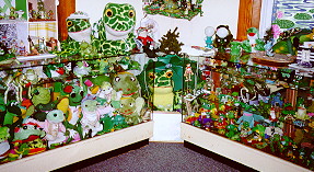 This is "Frog Fantasies," owned by Pat and Louise Mesa at 151 Spring Street in Eureka Springs. They claim that it is the largest collection of graven frog images in the world, and I have no reason to doubt them. They have gathered over 6,000 frog sculptures, salt-shakers, spoons, soap dishes, plush toys, puppets, pipes, humidors, candy dishes, ironing sprinklers and what-have-yous; and they have displayed them in five tightly packed rooms, including a kitchen and bathroom. These is a lots of frogs.