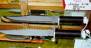 That surly character that looks like he's mugging Jimmy Lile at knifepoint is Sylvester Stallone, a big movie star. That knife was designed and built by Mr. Lile and was used by Mr. Stallone in the movie "First Blood." I guess by the name tags that this photo was taken at some kind of social function associated with the movie. Below are copies of the two knives made by Jimmy at Stallone's request. The bottom knife is the one used in "First Blood." The one above that was used in the sequel and has a blade one inch longer than the first. Bigger movie, bigger knife.