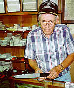 According to the guy at the shop, pictured below peeking over the tops of his glasses, Jimmy quit designing knives for the Rambo sequels because the movie companies kept trying to negotiate complicated merchandising contracts for the knife designs. Finally, he said, "To hell with it. Get yourself another boy. Working with movie company lawyers is like being pecked to death by chickens." Okay, I made up the quote, but it essentially explains why only the first two Rambo movies feature Jimmy's knives.