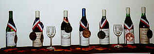 When you knock on the door at Cowie Wine Cellars, you're likely to be met at the door by owner Bob Cowie, pictured here, in his work clothes. What you see here is the Cowie corporate image, also the Cowie personal image. The effort and resources that he doesn't expend on business suits and sophisticated advertising winds up in the bottles pictured below -- the ones with all the MEDALS ON THEM!