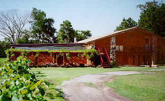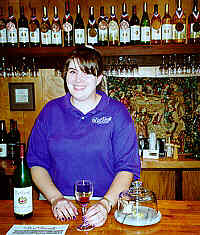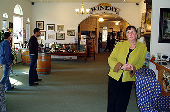 The results must have been encouraging, because in 1998, as she was preparing to graduate from college in Oklahoma, she bought ten acres of vineyard in Altus along highway 164. She built a platform on which she pitched a tent and in which she lived on weekends for six months from March to October of that year while permanent structures were being built. In spring of 2001 she opened her winery selling vintages she bottled in 1999 and 2000. She promises three thousand gallons of wine this year and now that she has almost 40 acres of plantable vineyard, she plans an eightfold increase in production over the next five years. Here she is in her new tasting room with a customer.